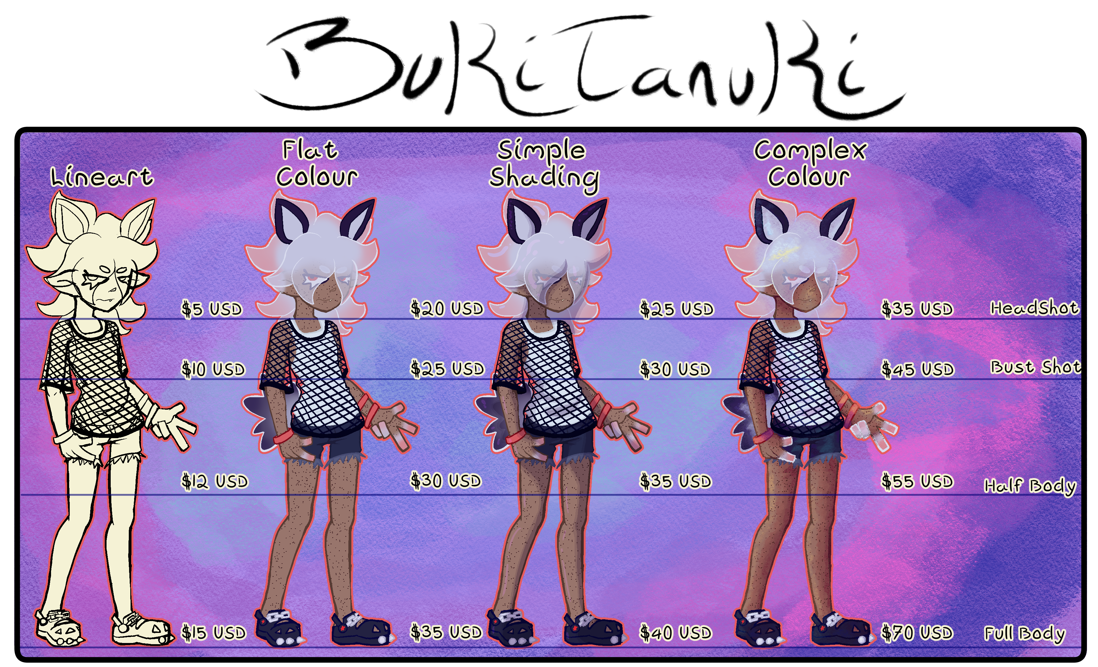 Send me a DM on Discord (Bukitanuki) with refs and what you're interested in and we can discuss the details! Deposit is 50% up front and the other 50% upon completion. I'll send you a WIP (or multiple) once the initial sketch has been completed for your approval. Small adjustments will be made for free at this stage, but large adjustments, and adjustments made after the colouring stage may be subject to a fee.